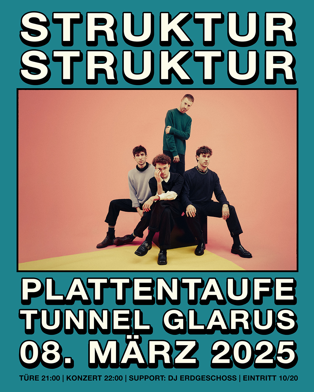 Vincent Rigling [g], Leander Schöpfer [b], Simon Scherrer [dr] and Silvan Schmid [dr] make up the formation STRUKTURSTRUKTUR, which was founded in fall 2021. In search of their own musical identity, the four musicians create a structure of constructed beauty that explores the ambivalence of things and leaves contradictions in the room. Their own listening habits serve as foils and are often traced until only outlines are recognizable. The result is a «negative space» of popular music. Flickering, static structures appear behind repetitive and polyrhythmic patterns. Quick stops break up standing planes, interlocking lines become a coherent whole. Soft edges surround the sharpened voices. The driving force of striding forward meets the supposed standstill.